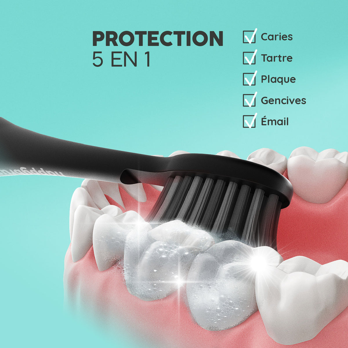 Black is the new white : la formule à base de charbon actif agit contre les colorations dentaires et procure un blanchiment naturel. Le calcium, quant à lui, favorise la reminéralisation de vos dents.
