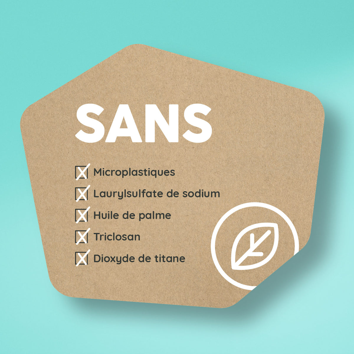Vegan, sans gluten, sans microplastique, fabriqué en Allemagne dans un tube recyclé à 30% et 100% recyclable.