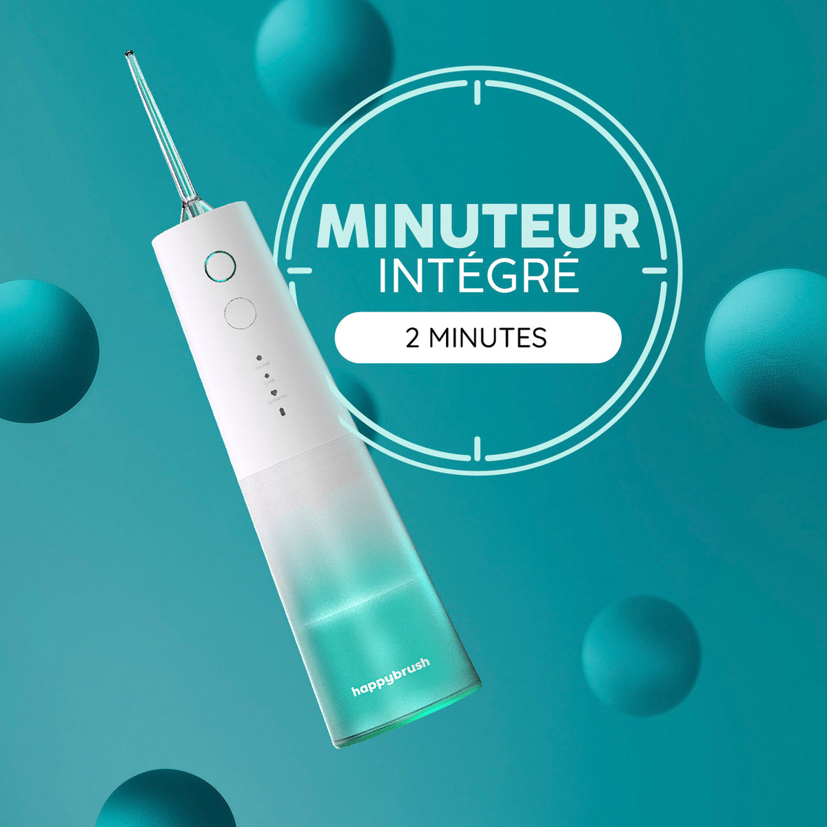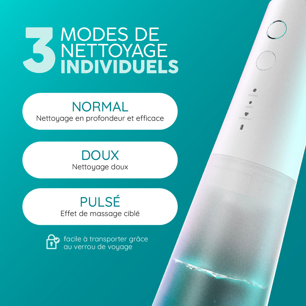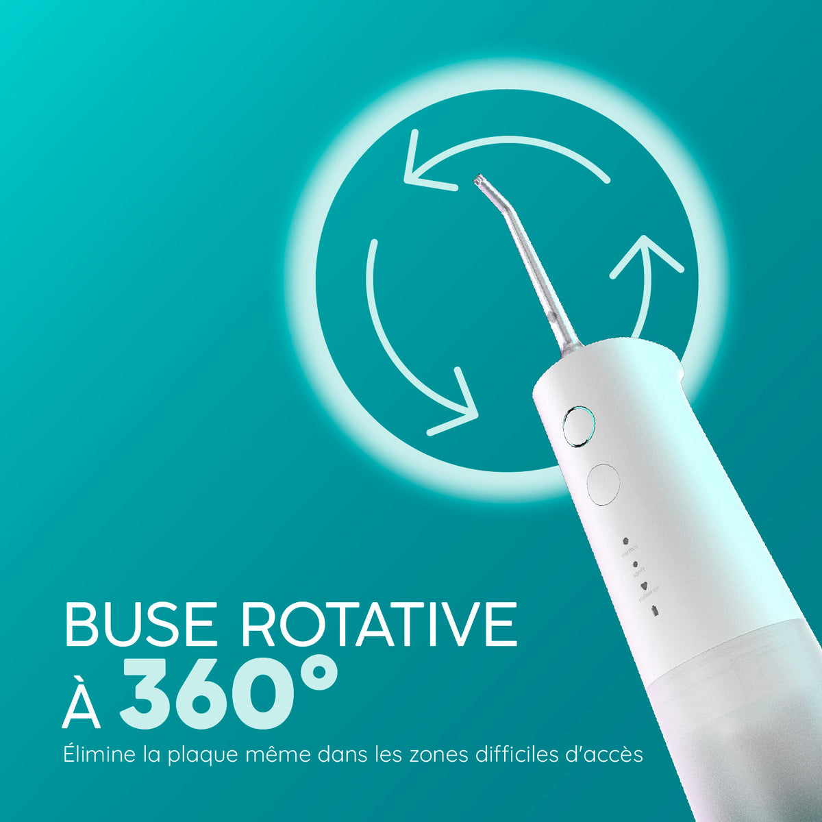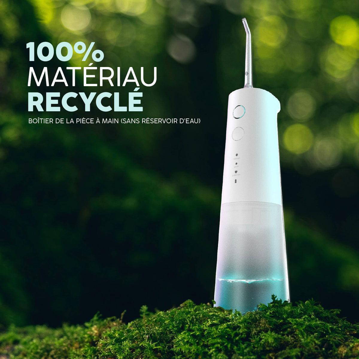Je suis ton nouveau jet dentaire Eco Flow et j'assure un nettoyage efficace de tes espaces interdentaires. Ma canule rotative à 360° élimine la plaque dentaire même dans les endroits difficiles d'accès. Ma batterie puissante dure jusqu'à 3 semaines et le boîtier de ma pièce à main (sans réservoir d'eau) est fabriqué à partir de matériaux recyclés à 100 %. Testé cliniquement et développé avec des experts dentaires. Let it flow!