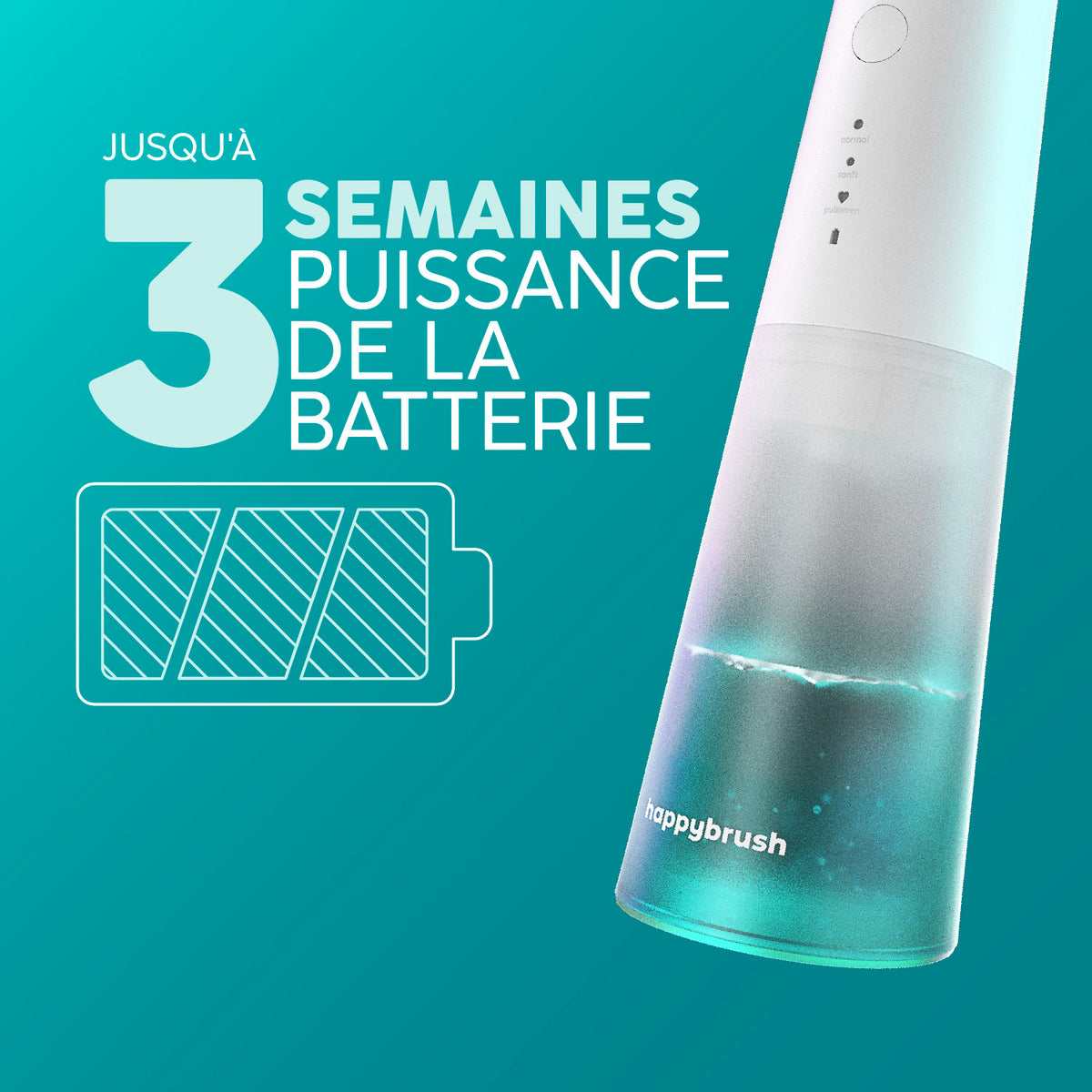 La batterie puissante de nos brosses à dents électriques t'accompagne très longtemps dans tes aventures : jusqu'à 6 semaines avec la brosse à dents sonique Eco Vibe 3 jusqu'à 3 semaines avec la brosse à dents rotative R2
